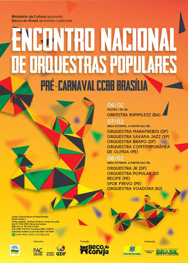 Em Brasília, a comemoração será neste fim de semana, quando o frevo agitará a cidade na folia pré-carnavalesca intitulada Encontro Nacional de Orquestras Populares, promovido pelo Centro Cultural Banco do Brasil (CCBB), no SCES – Trecho 2.