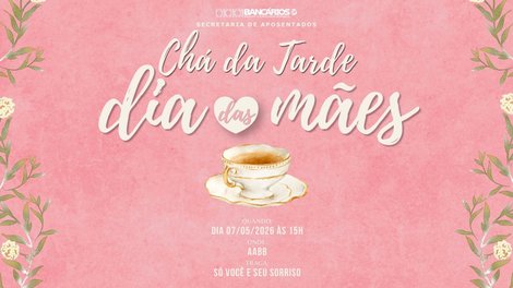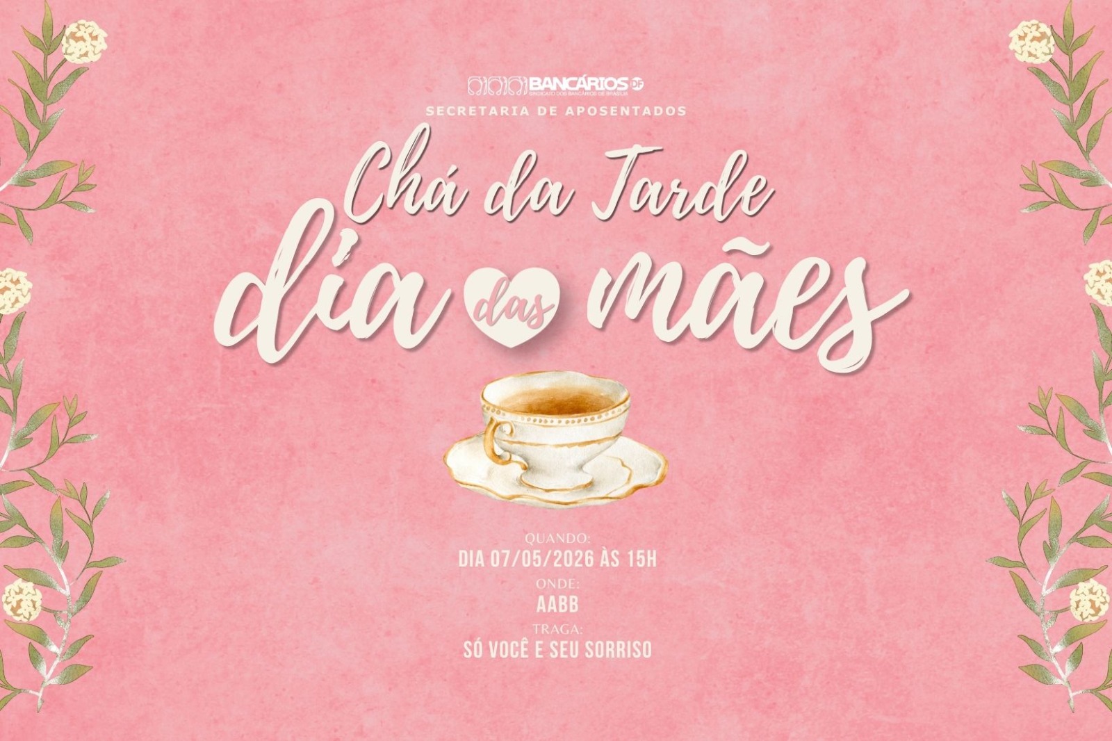 O Sindicato promove no dia 7 de maio um Chá da Tarde especial em comemoração ao Dia das Mães. O encontro será realizado às 15h, no Bangalô da AABB, reunindo bancárias aposentadas sindicalizadas em um momento de confraternização, acolhimento e celebração.