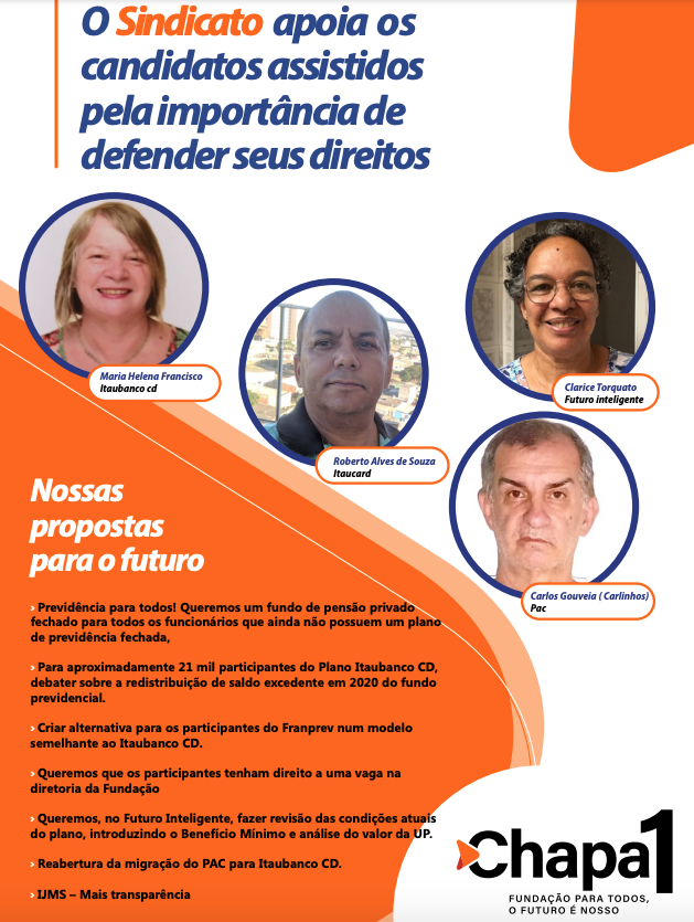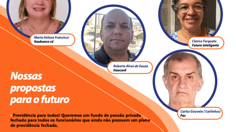 "Integro a Chapa 1 para dar continuidade à nossa luta, hoje com ênfase na defesa dos aposentados, mas também somando forças para a garantia dos interesses de todos os funcionários do Itaú. A Fundação administra atualmente 14 planos de previdência e vamos lutar para que todos tenham acesso ao fundo de pensão”, ressalta Robertinho.