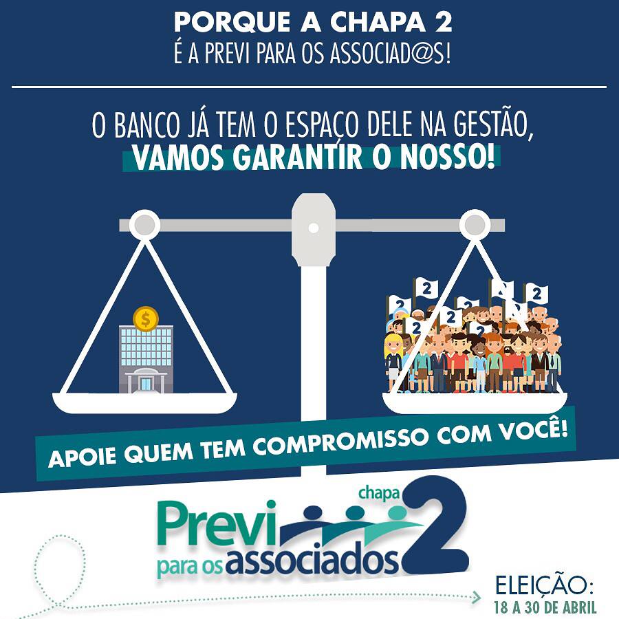 A Chapa 2 vê a necessidade de uma atuação firme e articulada com os associados e suas entidades representativas pela garantia da composição paritárias de todas as instâncias de gestão – Diretoria e conselhos Deliberativo, Fiscal e Consultivo. A gestão paritária é uma conquista histórica, que passou a ser seriamente ameaçada no âmbito do Congresso Nacional pelo Projeto de Lei 268, de autoria do senador mineiro Aécio Neves.