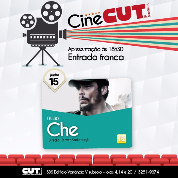 O Cine CUT Brasília apresenta nesta quarta feira (15) o filme Che, a partir das 18h30, a mais completa versão cinematográfica da história de Che Guevara, dirigido por Steven Soderbergh. A exibição antecede o dia de nascimento de Che, por isso a sessão servirá como homenagem ao aniversário daquele que é considerado um dos grandes líderes revolucionários da América Latina