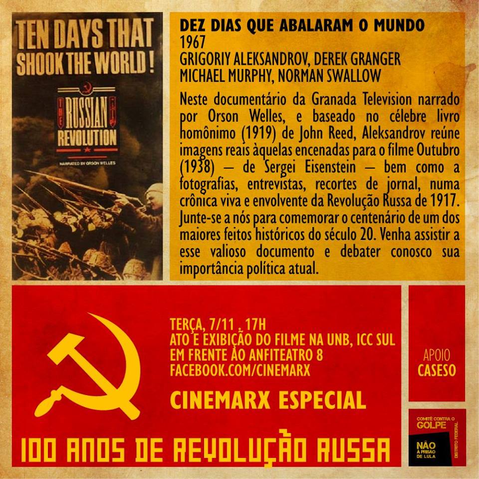 Numa realização do Comitê contra o Golpe - DF, em comemoração aos 100 da Revolução Russa, o CineMarx exibe especialmente nesta terça-feira (7) o filme-documentário "Dez dias que abalaram o mundo", de 1967. A exibição, que contará com um ato e vai reunir diversas lideranças políticas conclamando os estudantes e os trabalhadores a lutarem contra o golpe, terá início às 17h no Instituto Central de Ciências Sul da UnB, em frente ao anfiteatro 8.