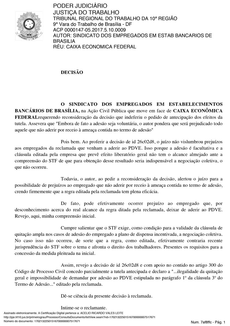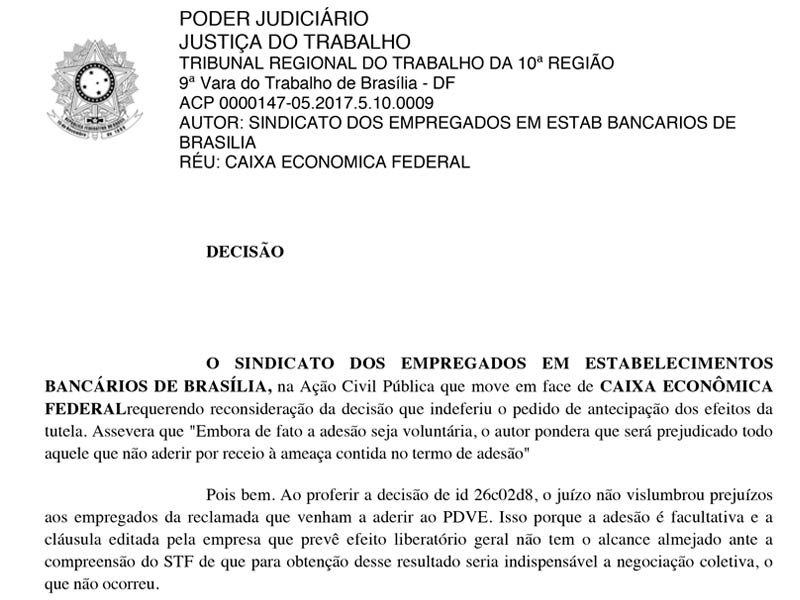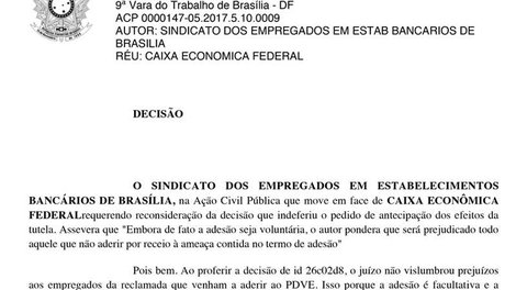 O juiz Acélio Ricardo Vales Leite declarou a ilegalidade da cláusula constante no termo de adesão ao PDVE da Caixa Econômica Federal, que dava quitação geral ao contrato de trabalho, em caráter liminar. O juiz acolheu o pedido de tutela de urgência solicitada pelo Sindicato, destacando que a manutenção da referida cláusula possibilitaria prejuízos aos empregados que deixariam de aderir ao programa de desligamento por receio das consequências da regra imposta pela empresa.