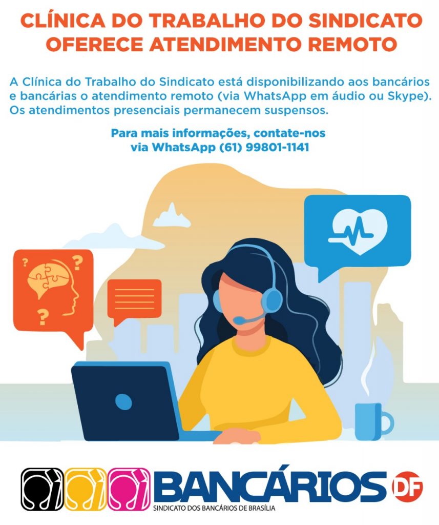 A Clínica do Trabalho do Sindicato está disponibilizando aos bancários e bancárias o atendimento remoto (via WhatsApp em áudio ou Skype). Os atendimentos presenciais permanecem suspensos.