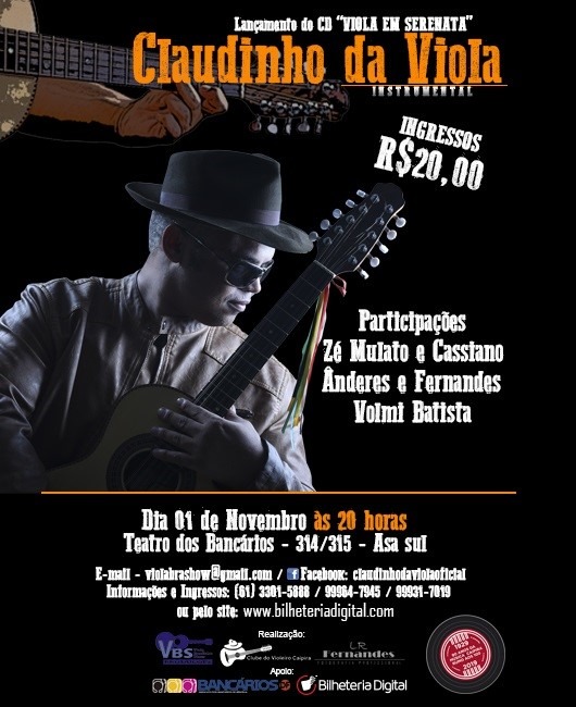 O compositor e violeiro Claudinho da Viola lança oficialmente seu primeiro CD nesta sexta-feira (1º), às 20h, no Teatro dos Bancários. “Viola em serenata” é composto por músicas instrumentais, quase todas de autoria do músico, primeiro deficiente visual a gravar um disco de viola instrumental.