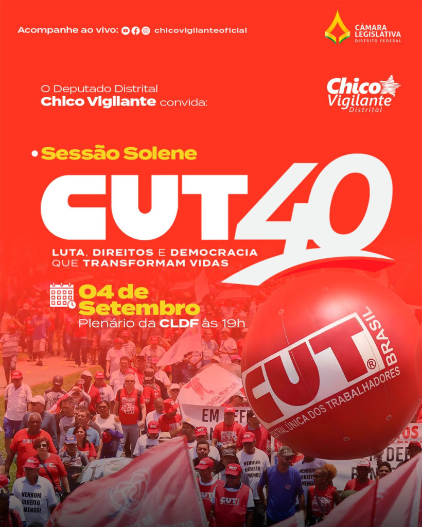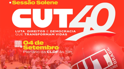 Em continuidade às comemorações dos 40 anos da Central Única dos Trabalhadores, na próxima segunda-feira (4/9), a Câmara Legislativa do DF realizará sessão solene para celebrar as lutas e as vitórias da Central. De iniciativa do deputado distrital Chico Vigilante (PT-DF), a atividade acontecerá às 19h, no Plenário da Casa.