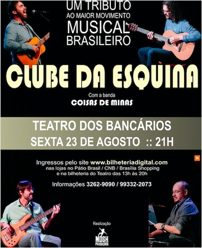 Um tributo ao maior movimento musical brasileiro. Os artistas brasilienses Pecê Sousa (violão e voz), Agilson Alcântara (guitarra e violão), Fernando Nantra (baixo) e Sandro Araújo (percussão) apresentam o show 'Coisas de Minas – canções e histórias do Clube da Esquina', no dia 23 de agosto, a partir das 21h, no Teatro dos Bancários.