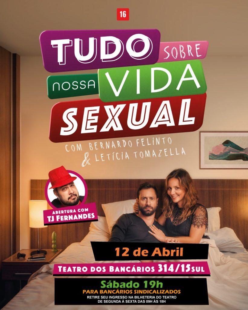 Após o sucesso de público, casas lotadas e mais de 50 mil espectadores, a comédia "Tudo Sobre Nossa Vida Sexual", com os atores Bernardo Felinto e Letícia Tomazella, retorna a Brasília no dia 12 de abril, às 19h, no Teatro dos Bancários, com sessão exclusiva para sindicalizados, que terão direito a duas cortesias.
