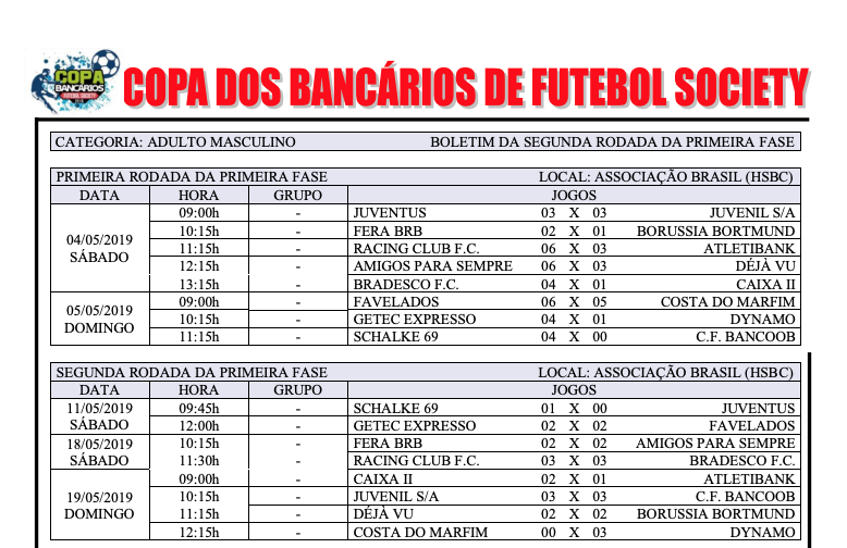 A segunda rodada da primeira fase da Copa dos Bancários 2019 chegou ao fim neste fim de semana, marcada por cinco empates, e o desempenho dos atletas em campo só aumenta. No total, os atletas bancários já balançaram as redes da Associação Brasil 83 vezes nesta edição da Copa. Nos três dias de jogos da segunda rodada, realizados excepcionalmente nos dias 11, 18 e 19, foram marcados 31 gols.