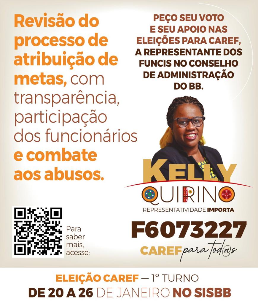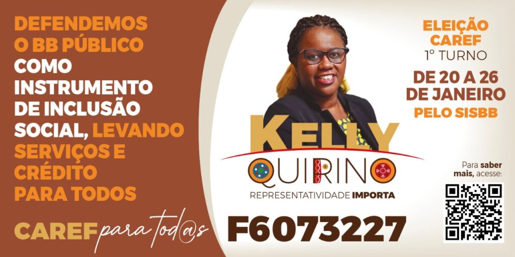Kelly encampa as pautas do funcionalismo, que incluem: fortalecimento do BB público; mais contratações e mais agências bancárias com plano de ascensão atualizado; impulsionamento do BB como agente redutor das desigualdades; e criação de um comitê de Diversidade e Inclusão. Pelo comprometimento com a agenda dos trabalhadores, Quirino propõe um mandato participativo, com canal direto entre Caref e os funcionários, além de trabalho alinhado à atuação dos sindicatos.