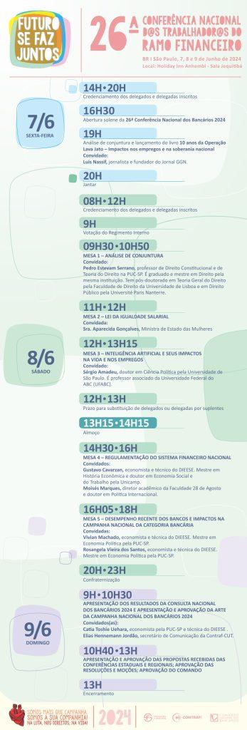A 26ª Conferência Nacional dos Trabalhadores do Ramo Financeiro vai até o domingo (9), quando, após uma série de debates e deliberações, será aprovada a pauta geral de reivindicações da categoria, além dos eixos de luta da Campanha Nacional 2024, para a renovação da Convenção Coletiva de Trabalho (CCT) e dos acordos específicos por bancos.