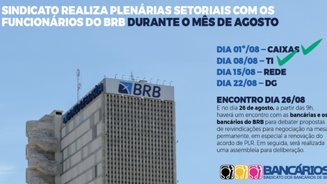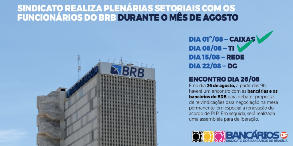 Não deixem de participar das plenárias! É uma oportunidade de debater e avançar nas questões relativas às condições de trabalho do BRB. Os encontros são realizados sempre às terça-feira, às 19h, em formato híbrido.