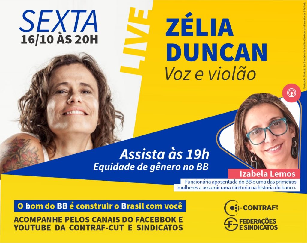 Parte das atividades em homenagem aos 212 anos do Banco do Brasil, iniciadas na segunda-feira (12), data de sua fundação, promovidas pelo Sindicato dos Bancários de Brasília, Contraf-CUT, demais sindicatos e federações de bancários se encerra nesta sexta-feira (16), às 20h, com um super show virtual da cantora Zélia Duncan, com voz e violão. O evento será transmitido ao vivo pelas redes sociais facebook.com/bancariosdf e youtube.com/bancariosbsb do Sindicato.