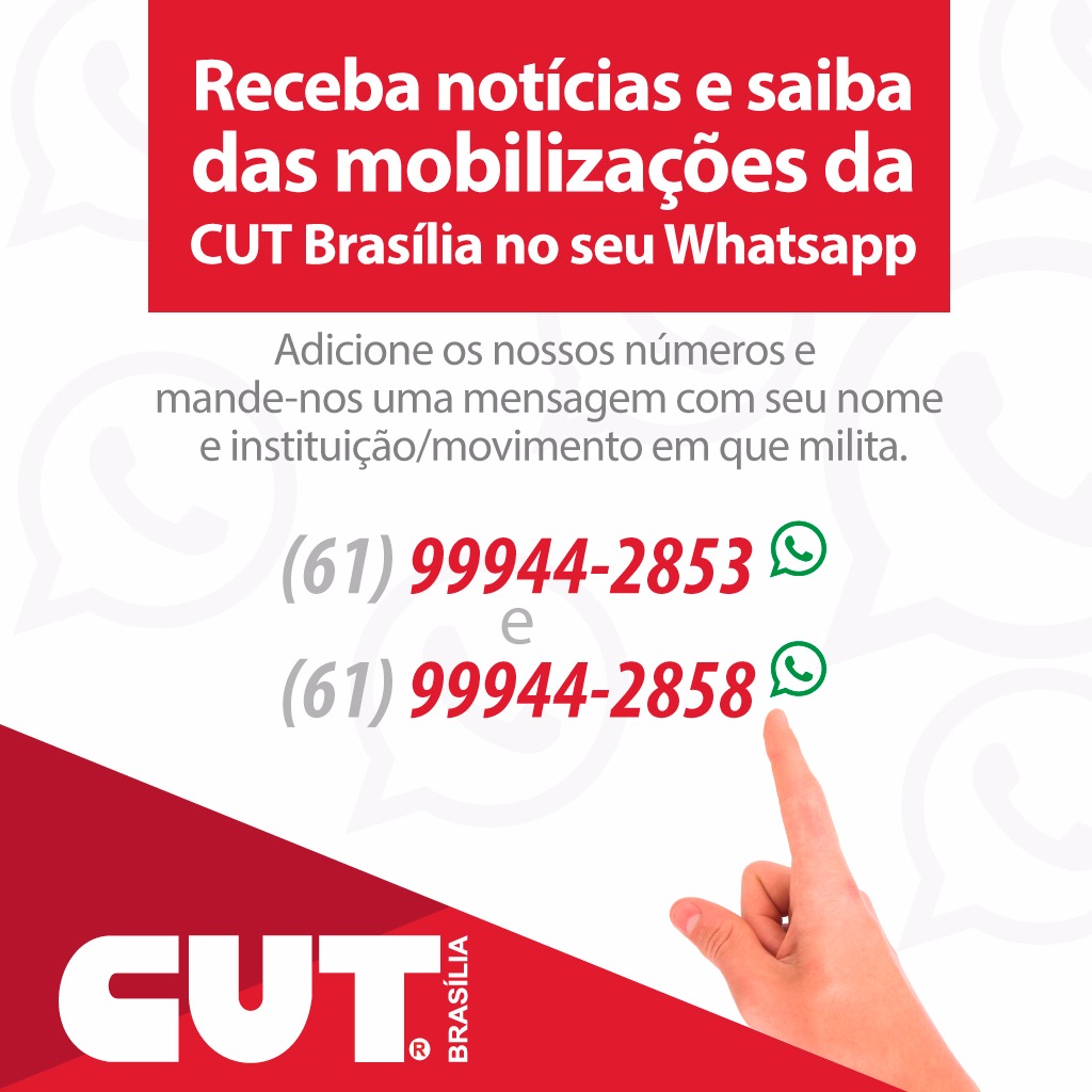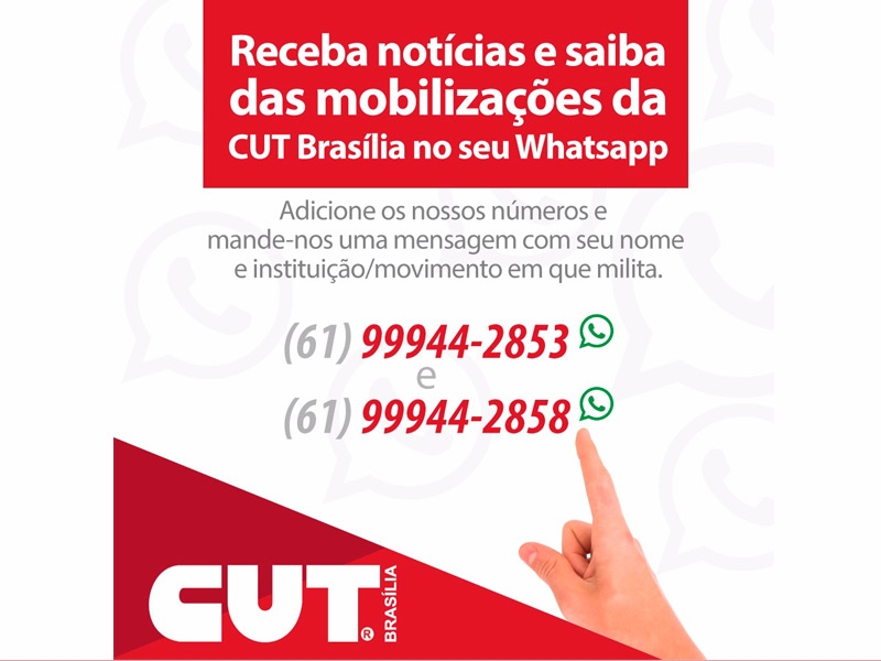 Para ampliar a comunicação com os trabalhadores e trabalhadores do Distrito Federal, a CUT Brasília está disponibilizando, diariamente, matérias e informes, sobre suas atividades e mobilizações via WhatsApp. Entre outros meios de comunicação da Central estão: TV, rádio, site, jornais e mídias sociais.