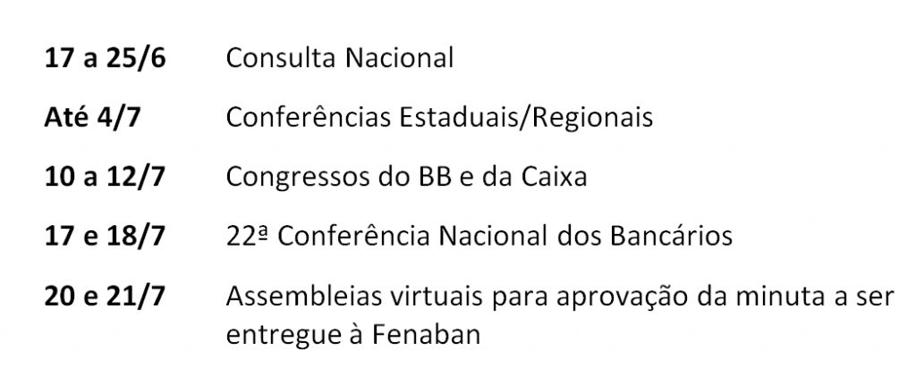 Os congressos do Banco do Brasil e da Caixa Econômica Federal serão realizados de 10 a 12 de julho e a Conferência Nacional dos Bancários, onde se define a minuta de reivindicações, nos dias 17 e 18 de julho, para a categoria deliberar sobre a pauta em assembleias que devem ser realizadas nos dias 20 e 21 julho e a minuta de reivindicações podendo ser entregue à Federação Nacional dos Bancos no dia 23 de julho.