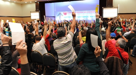 O Comando Nacional dos Bancários, coordenado pela Contraf-CUT, fará a entrega da minuta de reivindicações da categoria para a Fenaban no próximo dia 11 de agosto (segunda-feira), às 11 horas, em São Paulo. A pauta foi aprovada na 16ª Conferência Nacional, realizada de 25 a 27 de julho, em Atibaia (SP), com a participação de 634 delegados e delegados de todo o país.