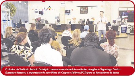 A empresa contratada, a Quântica, já está em fase de captação das expectativas dos diversos segmentos dos funcionários e, segundo ela, a ideia é resolver por partes os diversos problemas detectados, como 7ª e 8ª horas, valorização dos Asnegs, situação dos advogados, piso, entre outros. Dessa forma, ainda segundo a empresa, e também o banco, os diversos assuntos não precisam de uma pacote completo para serem implementados, pois esse processo pode ser gradativo, à medida que sejam maturados os assuntos e negociados com o Sindicato.