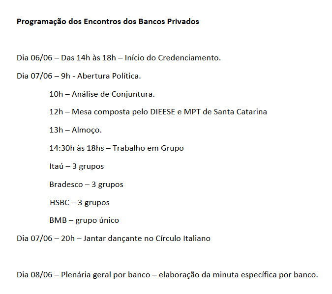 Segue abaixo a programação dos Encontro Nacionais dos Bancos Privados.
