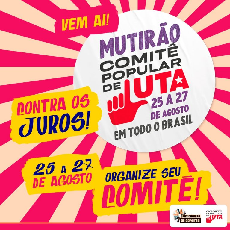 Os Comitês Populares de Luta realizam um novo Mutirão Contra os Juros, com ações de sexta-feira (25) até domingo (27). A mobilização tem objetivo de manter a pressão sobre o Banco Central (BC), presidido por Roberto Campos Neto, para baixar a taxa básica de juros Selic, hoje em 13,25% ao ano.