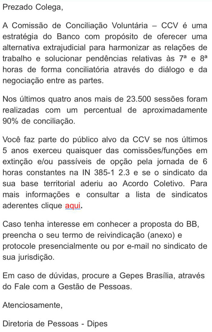 O Banco do Brasil divulgou nesta sexta-feira (20) comunicado (leia abaixo) sobre a Comissão de Conciliação Voluntária (CCV) cuja redação está causando confusão entre os bancários destinatários da mensagem (que foi direcionada a apenas alguns grupos). Isso porque a nota está repleta de equívocos, levando o Sindicato a se manifestar e esclarecer ao funcionalismo que: