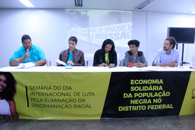 Compuseram a mesa o representante da Subsecretaria de Igualdade Racial, da Secretaria Adjunta de Políticas para Mulheres, Igualdade Racial e Direitos Humanos (Sepir/DF), Victor Nunes Gonçalves, a afroempreendedora Maria das Graças Santos, e os especialistas em Economia Solidária, Karla Patrícia, e em Controle Social sobre o Estado, Antônio Gomes Costa Neto.
