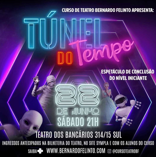 Túnel do Tempo, espetáculo de conclusão do Curso de Teatro Bernardo Felinto 2019 -- nível iniciante, será apresentado no dia 22 de junho, às 21h, no Teatro dos Bancários, para o público em geral. A direção é de Bernardo Felinto, Luis Eduardo Bergamaschi e Rebeca Reis.