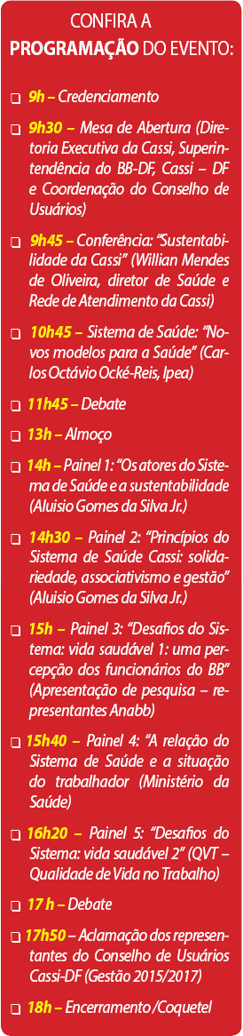 Na Conferência também serão empossados os novos membros do Conselho de Usuários da Cassi-DF (biênio 2015-2017). O Conselho é formado por representantes de diversos segmentos de beneficiários e seus representantes são eleitos e/ou indicados e renovados a cada dois anos. O objetivo principal deste órgão é de acompanhar, divulgar, sugerir, de forma democrática e participativa, ações de proteção, promoção, recuperação e reabilitação para melhoria da qualidade de vida e, ainda, fortalecer a participação social no âmbito da instituição.