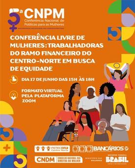 A Secretaria da Mulher da Fetec-CUT/CN entende que as Conferências Livres são um importante espaço de diálogo e de debates para construção de um país livre de violências, discriminação e assédio para todas as mulheres. A Conferência Livre de Mulheres da Fetec-CUT/CN terá como tema Trabalhadoras do ramo financeiro do Centro-norte em busca de equidade e será realizada dia 17 de junho, das 15h às 18h, em formato virtual pela plataforma Zoom.