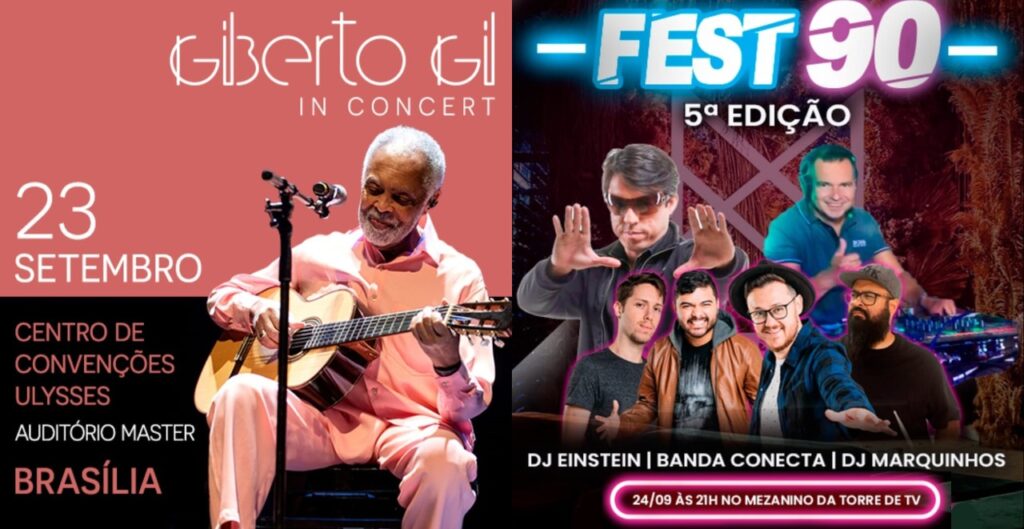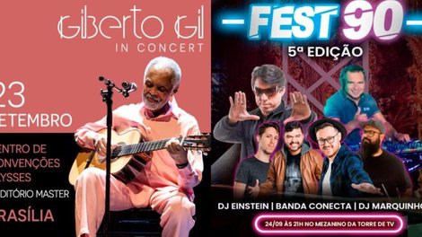 Gilberto Gil se apresenta na sexta-feira (23) e no sábado (24), no Centro de Convenções Ulysses Guimarães, sempre às 21h30. Já a 5ª edição da Fest 90 vai rolar no sábado (24), às 21h, no Mezanino da Torre de TV. As atrações estão imperdíveis: Banda Conecta e os Djs Einstein e Marquinhos.