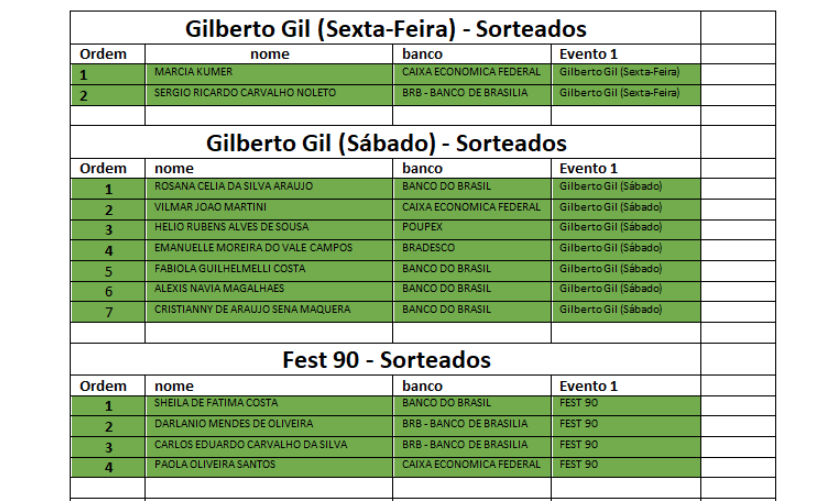 O Sindicato divulga o nome dos bancários sindicalizados sorteados com ingressos para o show Gilberto Gil in Concert e a Fest 90, que acontecem em Brasília, neste final de semana. Cada contemplado receberá no seu local de trabalho um par de ingressos.