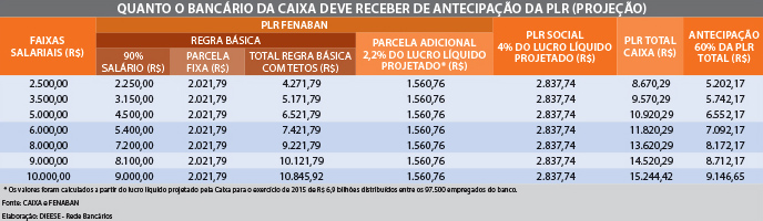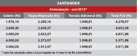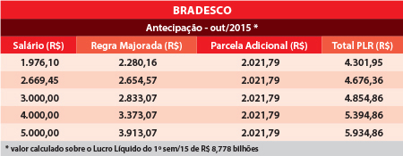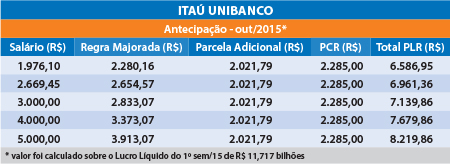Baseado nos lucros que Itaú, Bradesco e Santander apresentaram no primeiro semestre, o Sindicato calculou quanto os bancários receberão de antecipação, a partir do piso da categoria (R$ 1.976,10) até o salário de R$ 5 mil. No caso do Itaú, a antecipação da PLR soma-se ao PCR de 2015.