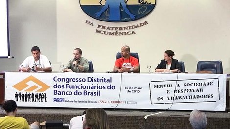 Servir a sociedade e respeitar trabalhador foi o tema que norteou a discussão das pautas especificas para a campanha salarial 2010 durante o Congresso Distrital dos funcionários,do Banco do Brasil na tarde do dia 15 de maio, no auditório da LBV. As propostas foram votadas e aprovadas em assembleia e as resoluções serão encaminhadas para 21º Congresso Nacional dos Funcionários do BB pelos delegados eleitos no encontro de sábado. Os principais temas de discussão foram saúde, previdência e as questões em discussão nas Mesas Temáticas e de Negociação permanente com o banco.