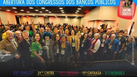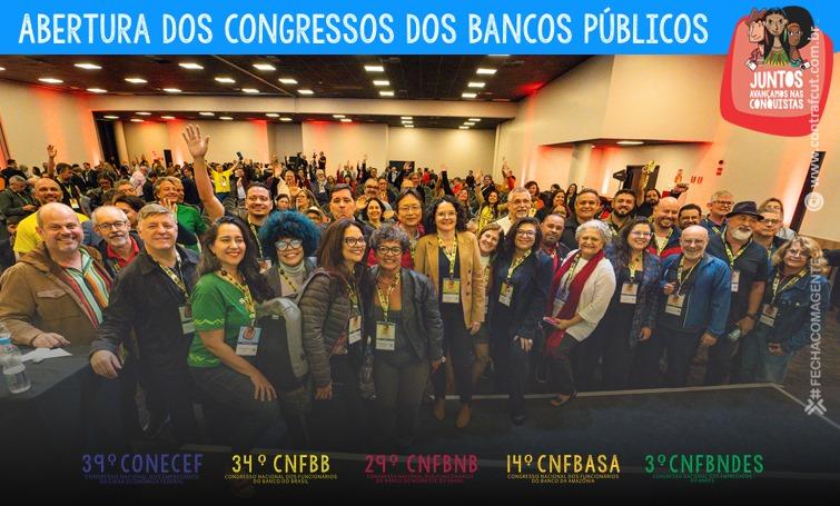 “Juntos avançamos nas conquistas”. Com este lema, foram declarados abertos o 39º Congresso Nacional dos Empregados da Caixa Econômica Federal (Conecef), o 34º Congresso Nacional dos Funcionários do Banco do Brasil, o 3º Congresso Nacional dos Funcionários do BNDES, o 16º Congresso dos Funcionários do Banco da Amazônia e o 29º Congresso Nacional dos Funcionários do Banco do Nordeste do Brasil, na noite desta terça-feira (4), em São Paulo.