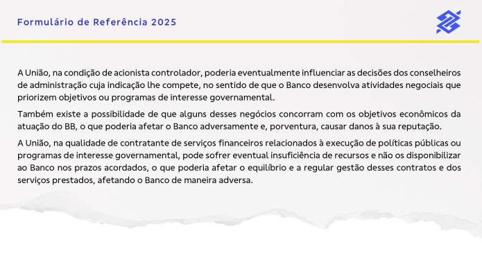 Num momento em que o debate das eleições gerais de 2026 encontra-se antecipado e propostas da extrema direita sobre o fim dos bancos públicos voltam ao cenário político nacional, o Conselho Diretor do Banco do Brasil faz um golaço contra. No Formulário de Referência 2025, item 4, que trata dos Fatores de Risco, o BB faz críticas à União, seu acionista controlador, ao dizer que, ao desenvolver “atividades negociais que priorizem objetivos ou programas de interesse governamental [...] existe a possibilidade de que alguns desses negócios concorram com os objetivos econômicos da atuação do BB, o que poderia afetar o Banco adversamente e, porventura, causar danos à sua reputação”.