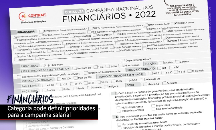 A campanha dos financiários para a renovação da Convenção Coletiva de Trabalho da categoria já começou! E a Confederação Nacional dos Trabalhadores do Ramo Financeiro (Contraf-CUT) e demais entidades de representação sindical querem saber qual a opinião de cada um sobre as prioridades para a campanha.