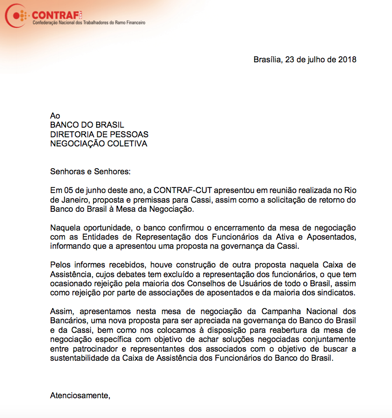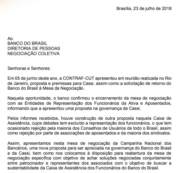 Na reunião de negociação da Campanha Nacional 2018 com o Banco do Brasil, nesta segunda-feira (23), sobre saúde e condições de trabalho, os sindicatos entregaram proposta detalhada de sustentabilidade na Cassi, em que abordam o histórico das questões financeiras, o debate da Caixa de Assistência e faz uma análise da situação atual. No texto, foram detalhados os princípios aprovados no Congresso Nacional dos Funcionários do BB, realizado em junho, inclusive com proposta financeira.