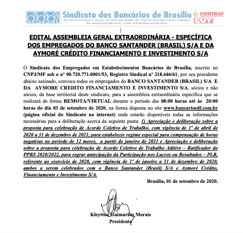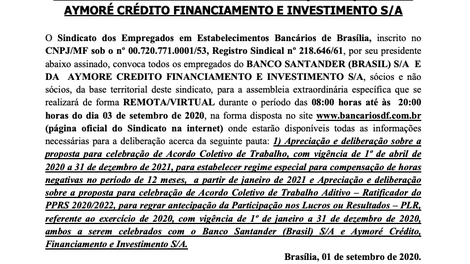 Os aditivos de adiantamento de 100% da PLR e do banco de horas negativo, referente às horas afastadas em decorrência da pandemia serão levados para a aprovação em assembleia específica dos funcionários que o Sindicato realiza por meio virtual, pelo portal da entidade, na próxima quinta-feira (3), das 8h às 20h.