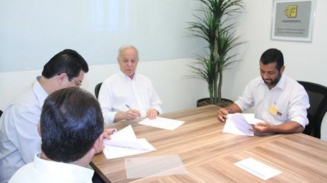 O presidente em exercício do Sindicato, Eduardo Araújo (direita), durante a assinatura do acordo