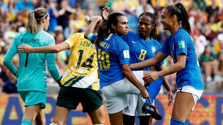 Ao comemorar o gol na partida do Brasil contra a Austrália, na quinta-feira passada (13), Marta apontou para a chuteira que estava usando. Preto, sem a estampa de uma marca esportiva, o calçado trazia duas faixas azul e rosa, símbolo da ação Go Equal, que busca promover a equidade salarial, promovida pela ONU Mulheres.