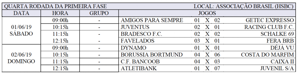 01- Getec 10pt, +5sd 02- Favelados 10pt, +4sd 03- Juvenil 8pt, +12sd 04- Schalke 8pt, +5sd 05- Juventus 7pt, +8sd 06- Amigos 7pt, +4sd 07- Fera BRB 7pt, 0sd 08- Bancoob 7pt, -2sd 09- Bradesco 5pt, -3sd 10- Racing 4pt, +1sd 11- Dynamo 4pt, -1sd 12- C Marfim 3pt, -4sd 13- Caixa II 3pt, -11sd 14- Déjà vu 2pt, -4sd 15- Borússia 1pt, -4sd 16- Atletibank 1pt, -10sd