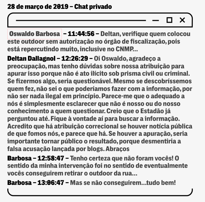 Dois dias depois, Oswaldo Barbosa entrou em contato com Dallagnol pelo Telegram para perguntar sobre o outdoor. “O outdoor existe, mas não sabemos quem o colocou ou pagou. Como imaginou corretamente, jamais faríamos isso… seria caso de internação, não de corregedoria rs”, respondeu o chefe da força-tarefa.