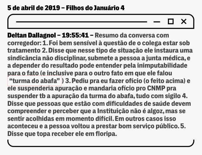 Ou seja: na iminência de ser investigado e afastado, Castor de Mattos apresentou um atestado médico, datado do dia anterior, para formalizar sua saída da Lava Jato. O documento, assinado por um médico de Curitiba, recomendava o afastamento do procurador por 30 dias. Os demais integrantes da operação decidiram não divulgar oficialmente as razões do colega para se afastar. “O objetivo disso não é nos preservar, mas preservar ele na verdade”, disse Dallagnol no grupo Filhos de Januário 4, respondendo a colegas que questionavam se deveriam publicizar o caso.