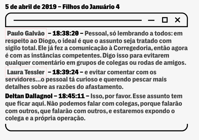 As conversas a que eles se referem ocorreram em 13 e 14 de maio de 2017 no grupo chamado 2017 – Parceiros/MPF – 10 Medidas., formado por procuradores engajados no projeto das 10 Medidas contra a Corrupção, encabeçado por Dallagnol. O assunto começou quando a procuradora Raquel Branquinho enviou o link de uma matéria que tratava do parentesco entre Diogo e Rodrigo. “Não há conflito de interesses nessas situações?”, disse em seguida.