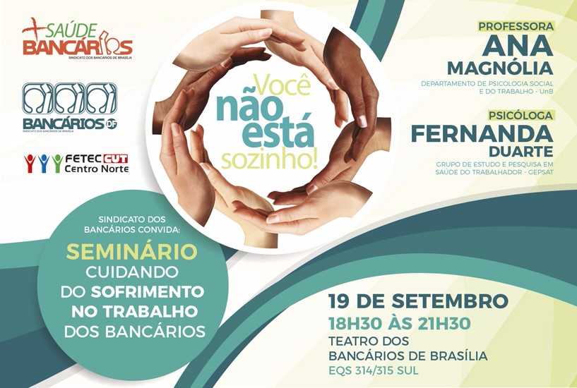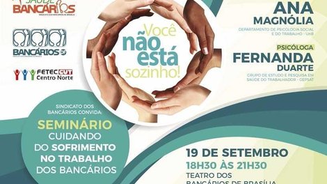 O Sindicato realizará, na próxima terça-feira (19), o seminário “Você não está sozinho - cuidando do sofrimento no trabalho dos bancários”. O encontro, que acontecerá na sede da entidade, às 18h30, contará com palestra da professora doutora Ana Magnólia Mendes, coordenadora do Grupo de Estudos e Pesquisas em Saúde e Trabalho (Gepsat) da UnB, e da psicóloga Fernanda Duarte, responsável pelo acolhimento, estudo e pesquisa da Clínica do Trabalho do Sindicato.