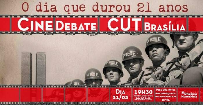 Em memória aos 51 anos da ditadura militar no Brasil, a CUT Brasília realizará um Cine Debate sobre “O dia que durou 21 anos”, um documentário de Camilo Tavares que aborda fatos que compuseram o cenário que antecedeu o Golpe Militar de 1964 no Brasil. O evento será realizado no dia 31 de março, às 19h30, tem novo local. Será no auditório Adelino Cassis, da CUT Brasília, localizado no Conic (SDS Edifício Venâncio V subsolo – loja 14).