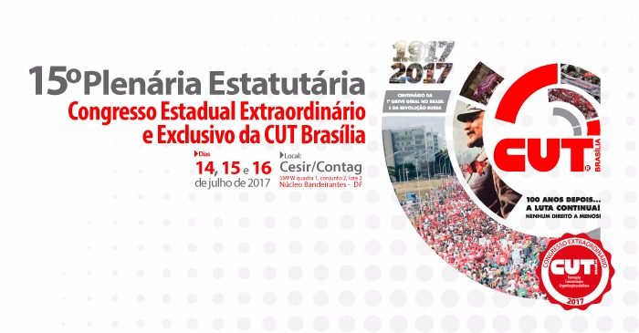 Em meio aos embates contra as reformas, a CUT Brasília promoverá sua 15ª Plenária Estatutária – Congresso Estadual Extraordinário e Exclusivo da CUT Brasília – para a construção do plano de lutas e desenvolvimento de estratégias para o próximo período. O evento terá a duração de três dias e acontecerá entre 14 e 16 de julho, na sede da Cesir/Contag (SMPW quadra 1, conjunto 2, lote 2 – Núcleo Bandeirantes – DF).