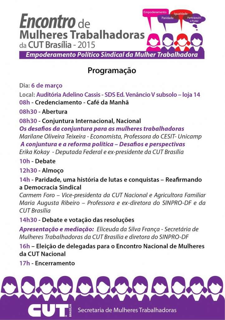 No Encontro da CUT Brasília, será formada uma delegação de mulheres sindicalistas para participar do Encontro Nacional de Mulheres promovido pela CUT, que reunirá trabalhadoras de todos os estados do Brasil. Este ano, a atividade será no Distrito Federal, nos dias 27, 28 e 29 de março. Veja programação completa abaixo.