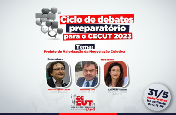 Começa nesta quarta-feira (31), o Ciclo de Debates preparatório para o Congresso Estadual da CUT (CECUT), uma série de discussões organizada pela Secretaria de Formação Sindical da CUT-DF. Sob o tema “Projeto de Valorização da Negociação Coletiva”, a atividade será realizada no auditório da Central, a partir das 9h30.
