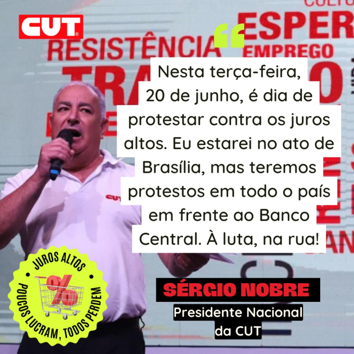 Para CUT, centrais e movimentos populares, manter a taxa nesse patamar é inaceitável. “O presidente do Banco Central, que foi colocado por Bolsonaro no cargo, está mantendo os juros altos já desde 2021 e, este ano, mesmo com a inflação caindo, mesmo com o PIB crescendo, ainda mantém os juros nesse patamar elevadíssimo, o maior do mundo”, diz Juvandia Moreira.