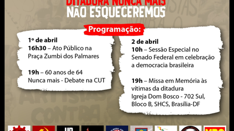 Intitulada “60 anos de 64, ditadura nunca mais!”, a ação terá início no dia 1º de abril, com ato na Praça Zumbi dos Palmares, no Conic, a partir das 16h30. Em seguida, às 19h, acontecerá debate sobre o tema, na sede da Central, também no Conic.